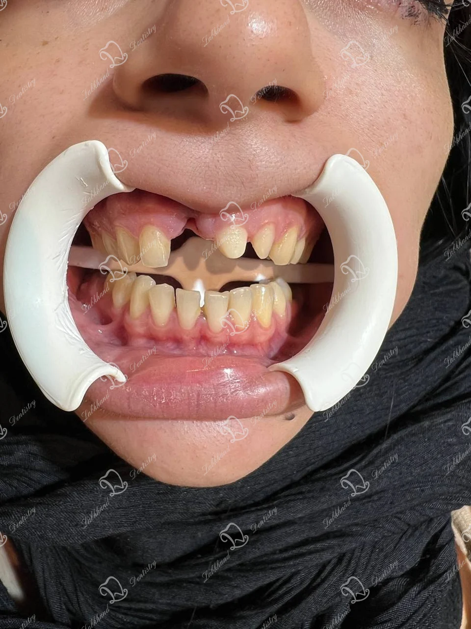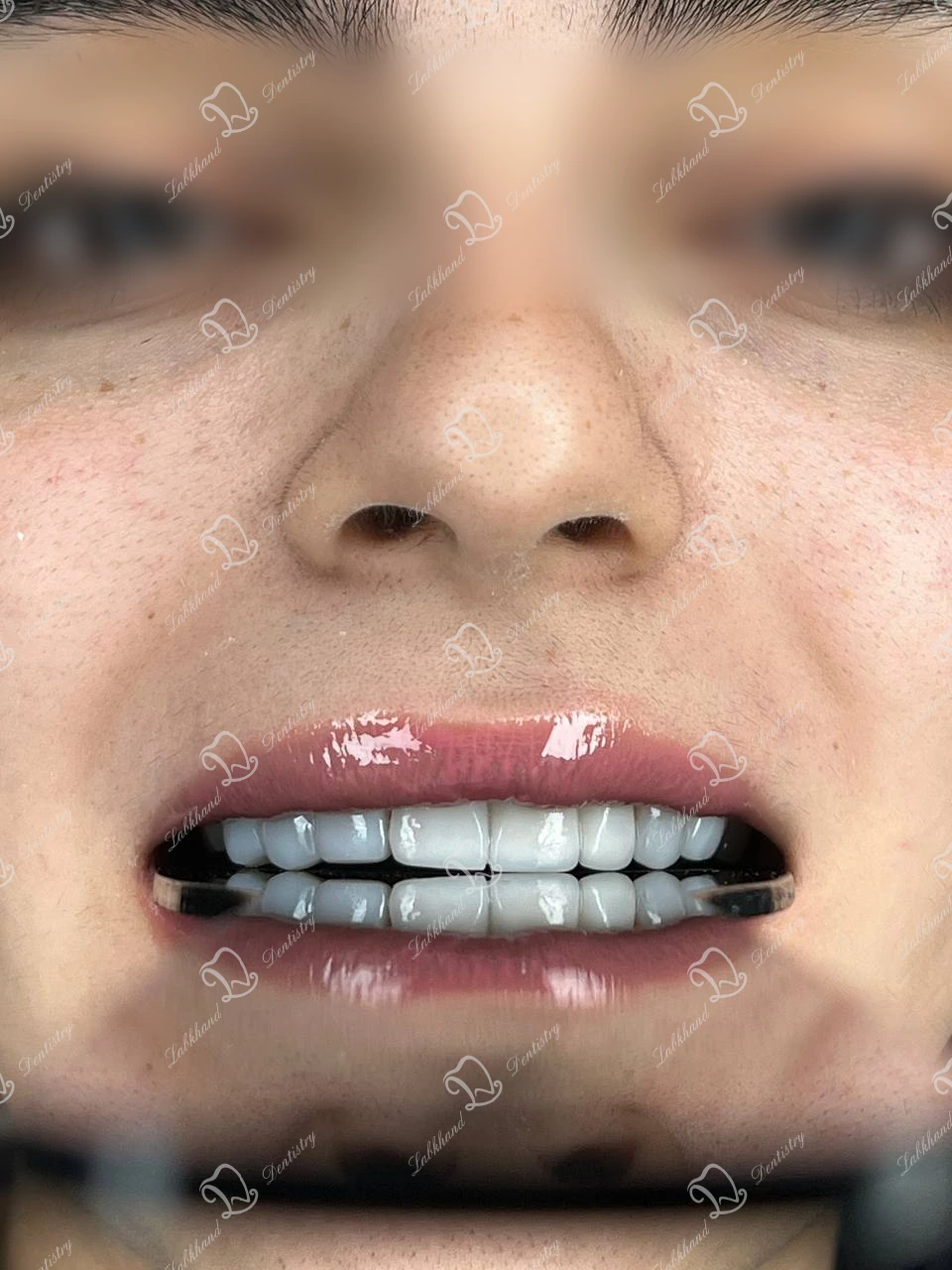 بیمار در اثر ضربه یکی از دندان های سانترال کاملا از دست داده ، و دندان شماره یک و دو سمت چپ دچار آسیب جدی شده بود، برای ایشون ترکیبی از روکش زیرکنیا و کامپوزیت ونیر انجام شد.